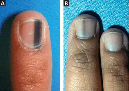 Dark vertical lines can be a sign of melanoma unless you might have hurt your finger somewhere.