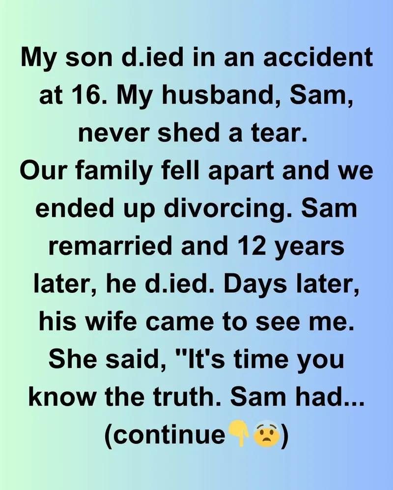 My son d.ied in an accident at 16. My husband, Sam, never shed a tear. Our family fell apart and we ended up divorcing. Sam remarried and 12 years later, he died. Days later, his wife came to see me.