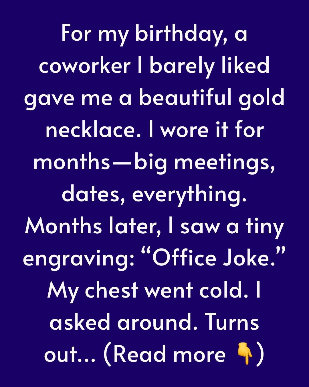 She even had a photo of the engraving as a punchline. I tossed the necklace—but kept the receipt. HR had questions of their own.