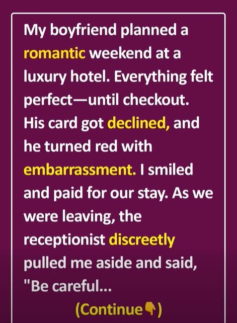 My boyfriend planned a romantic weekend at a luxury hotel. Everything felt perfect—until checkout. His card got declined, and he turned red with embarrassment. I smiled and paid for our stay. As we were leaving, the receptionist discreetly pulled me aside and said, “Be careful, I’ve seen this guy do the same thing with other women. He comes here, his card gets declined, and they end up paying for everything.”