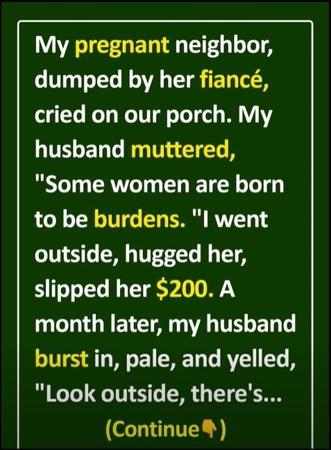 My pregnant neighbor got dumped by her fiancé and showed up on our porch sobbing. My husband got irritated and snapped, “Some women are born to be burdens. Tell this drama queen to go cry somewhere else.” I ignored him, went outside, hugged her, and slipped her $200. She cried even harder, this time from sheer relief.