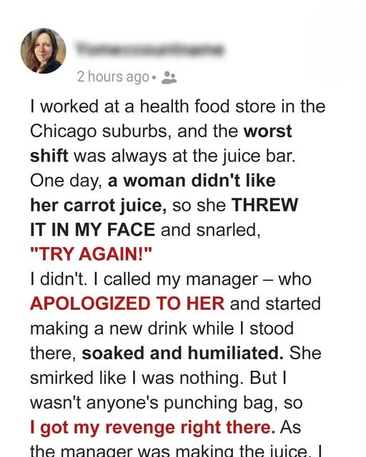 I worked at a health food store in the Chicago suburbs, and the worst shift was always at the juice bar. One day, a woman didn’t like her carrot juice, so she THREW IT IN MY FACE and snarled, “TRY AGAIN!” I didn’t. I called my manager—who APOLOGIZED TO HER and started making a new drink while I stood there, soaked and humiliated.