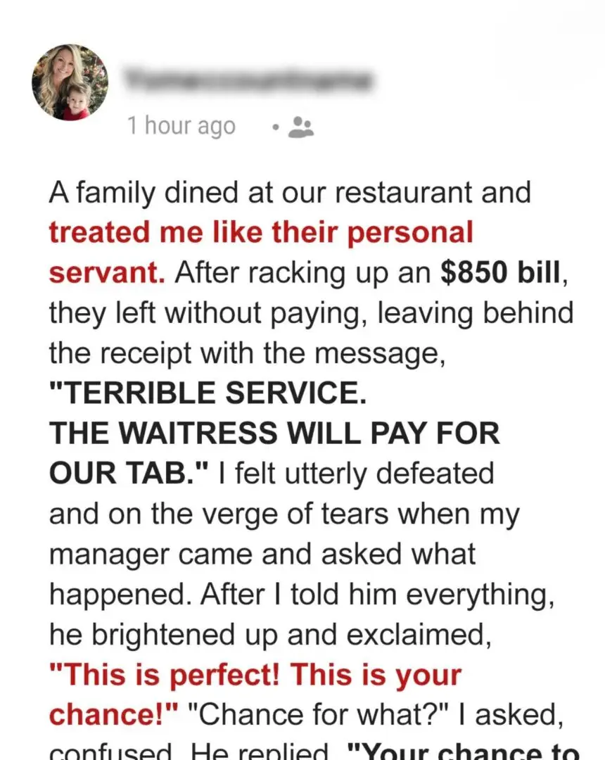 When a family skipped out on their $850 restaurant tab, I was devastated. But with my manager’s shrewd plan and an unexpected ally, we turned the tables in a way they never saw coming.