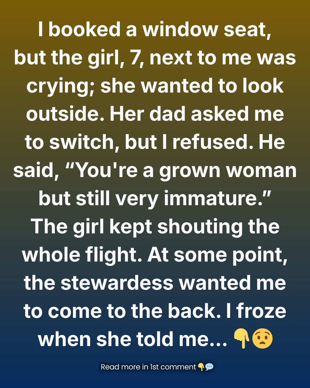 She kept insisting she had to look outside, and her father immediately leaned over and asked if I could switch seats with her. I politely declined. After all, I paid extra for that window seat, and it was part of the experience I genuinely looked forward to.