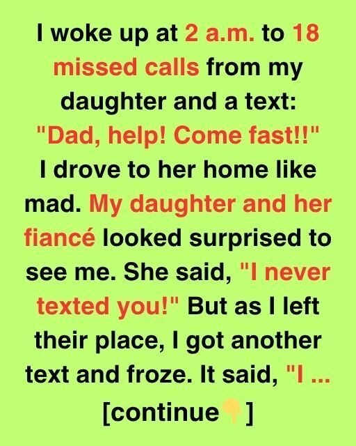 I woke up at 2 a.m. to 18 missed calls from my daughter and a text: “Dad, help! Come fast!!” I drove to her home like mad. My daughter and her fiancé looked surprised to see me. She said, “I never texted you!” But as I left their place, I got another text and froze. It said, “I’m not done yet.”