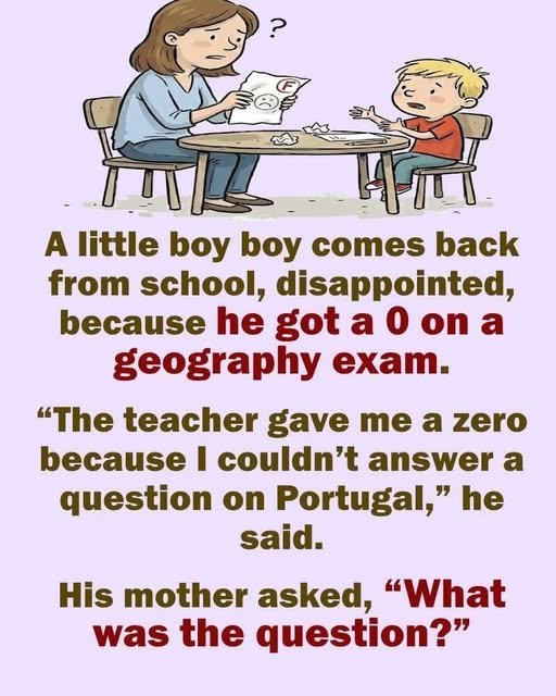 A little boy boy comes back from school, disappointed, because he got a 0 on a geography exam. “The teacher gave me a zero because I couldn’t answer a question on Portugal,” he said. His mother asked, “What was the question?”