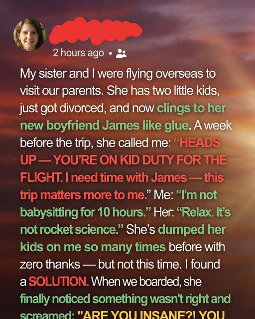 The airport was humming with early-morning energy when I met my sister at the gate, our suitcases lined up like quiet witnesses to an unspoken tension. We were traveling overseas to see our parents, a trip meant to be meaningful and restorative. My sister had been through a difficult year—divorce, adjustments, new responsibilities—and I genuinely wanted this journey to be a chance for both of us to reconnect with family. Still, when she casually informed me days earlier that I would be “on kid duty” for the entire flight so she could enjoy uninterrupted time with her new partner, something inside me paused. It wasn’t anger at first, just a familiar heaviness of being expected to carry what wasn’t mine to hold.