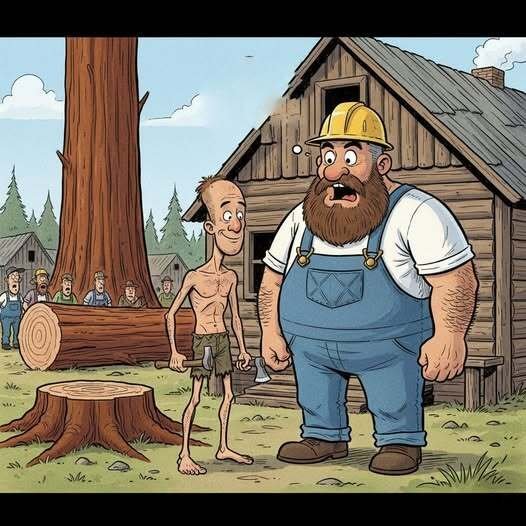 The skinny man headed for the tree, and in five minutes he was back knocking on the lumberjack’s door.