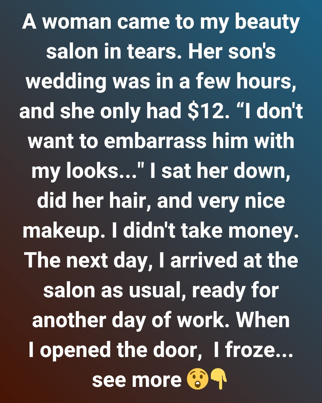 A woman came to my beauty salon in tears. Her son’s wedding was in some hours, and she only had $12. “I don’t want to embarrass him with my looks,” she whispered, her voice trembling.