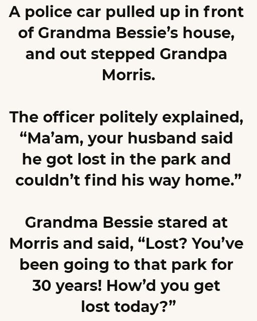 A police car pulled up in front of Grandma Bessie’s house, and out stepped Grandpa Morris. The officer politely explained, “Ma’am, your husband said he got lost in the park and couldn’t find his way home.”