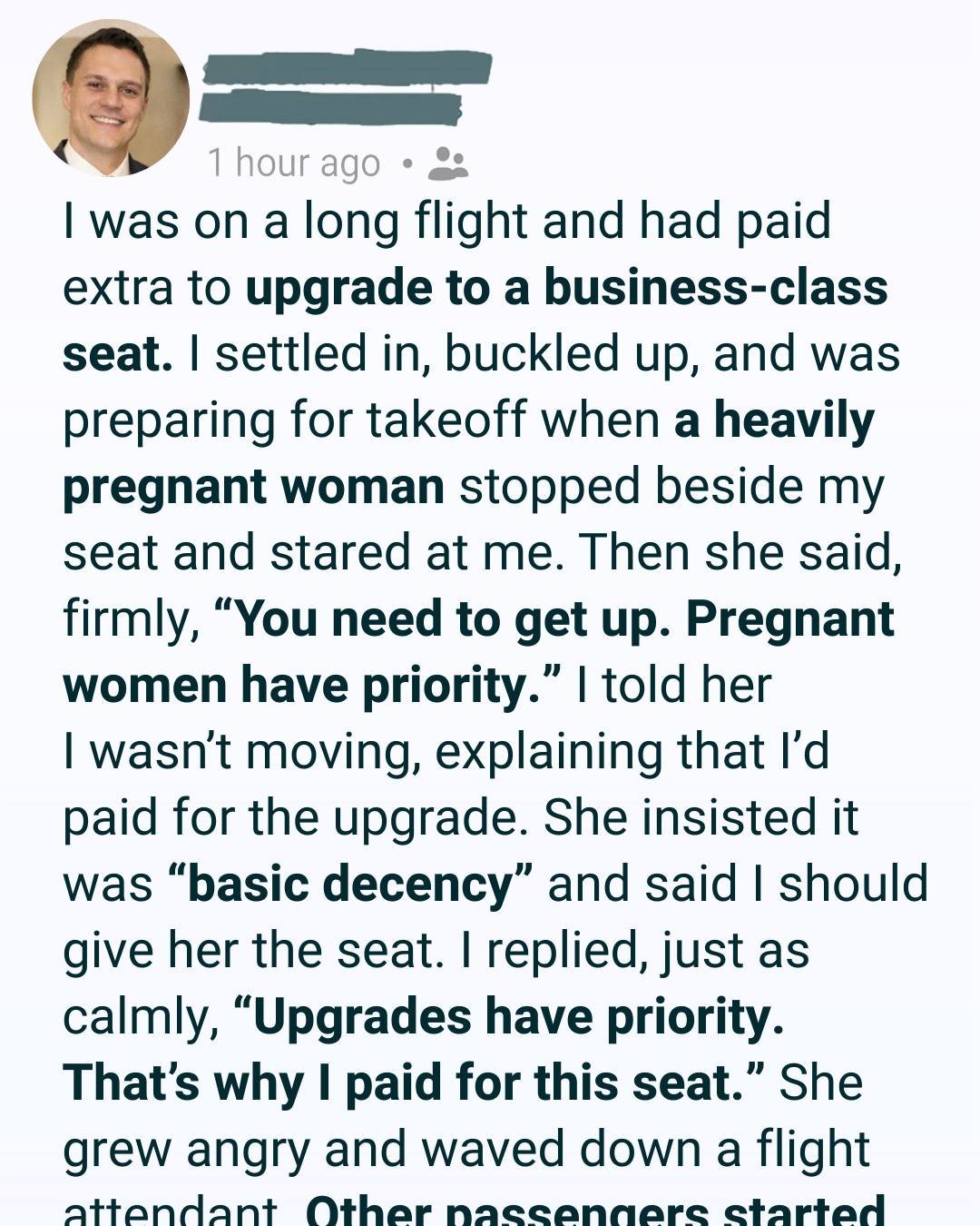 She said it was “basic decency,” that anyone with a conscience would give up their seat for a pregnant woman. I kept my voice calm, even though my heart was pounding. “I understand you’re uncomfortable,” I said, “but upgrades have priority.