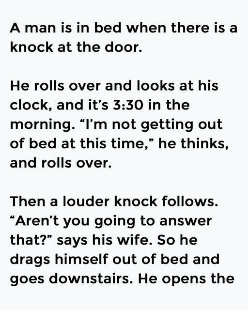 A man is in bed when there is a knock at the door. He rolls over and looks at his clock, and it’s 3:30 in the morning. “I’m not getting out of bed at this time,” he thinks, and rolls over.