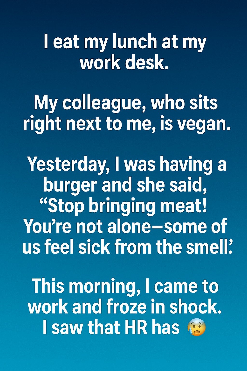So the next day, I took my lunch to the break room. To my surprise, she stopped by later with a smile and a homemade vegan cookie. “Thanks for understanding,” she said.