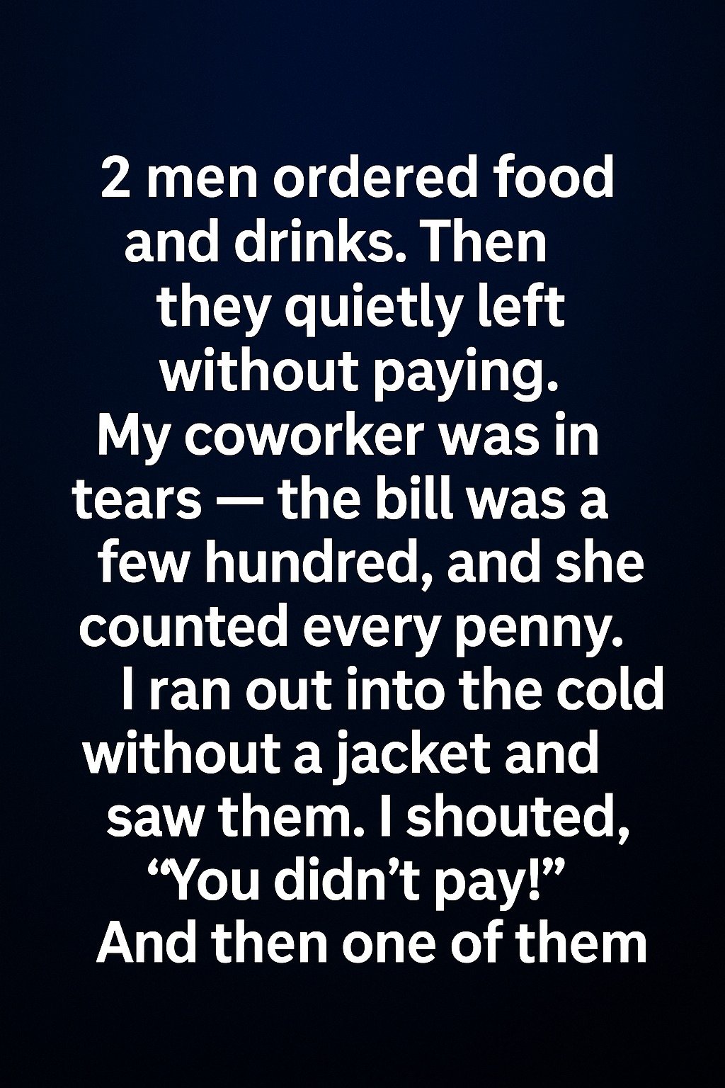 But when I explained that my coworker would be held responsible for the unpaid bill, their expressions softened. The taller man sighed and glanced at his friend before walking back toward me. “We thought it was already settled,” he said gently.