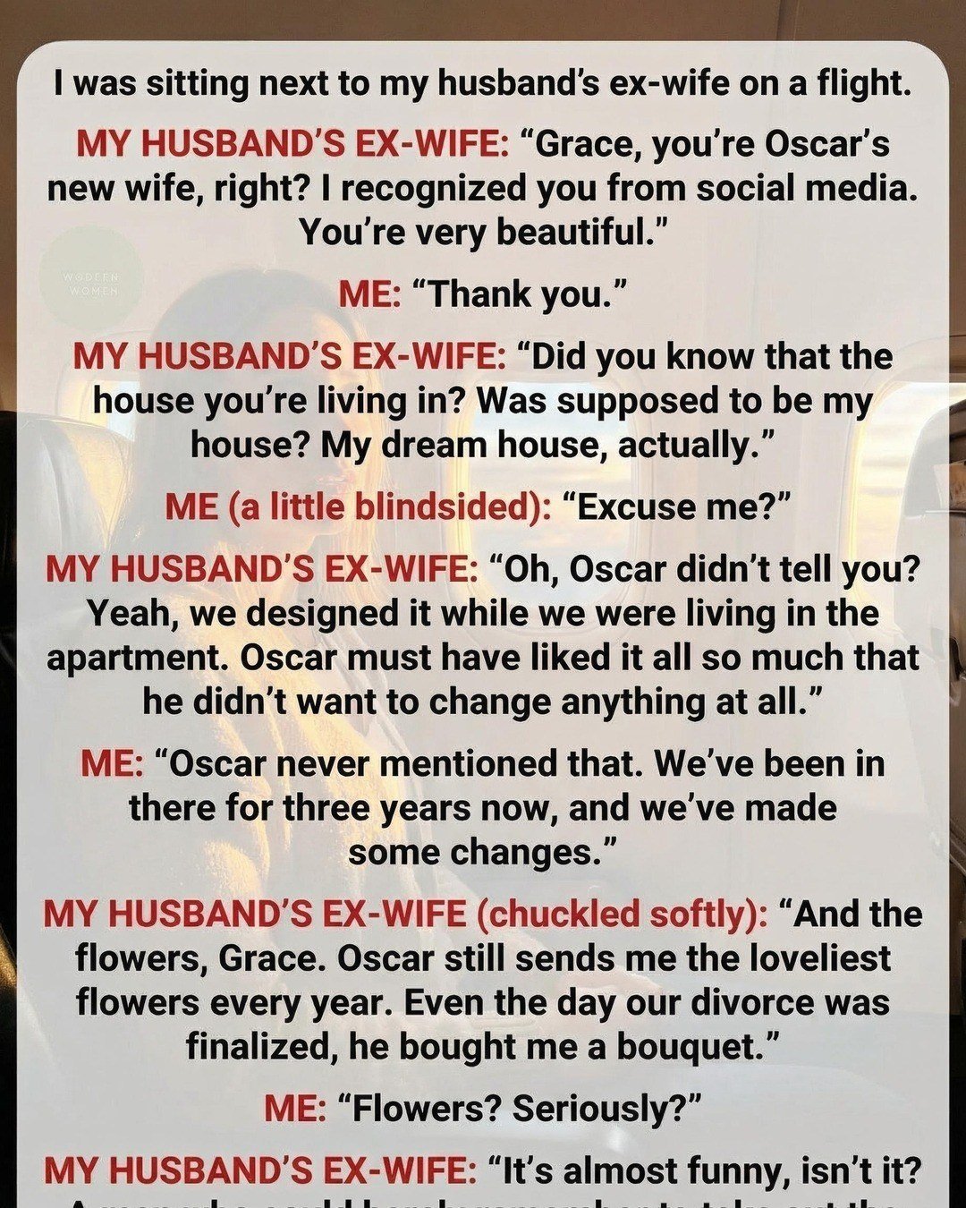 I was sitting next to my husband’s ex-wife on a flight. At first, it felt like some cosmic prank—two strangers assigned adjacent seats, only for the universe to reveal we weren’t strangers at all. She introduced herself with a warm smile, the kind that suggested she already knew more about me than I was comfortable with.
