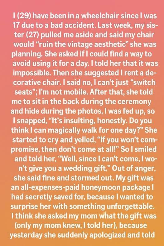 I loved my sister deeply, but her request cut deeper than she understood. It wasn’t just about a chair — it was about being asked to erase part of my life, my reality, for someone else’s picture-perfect moment. I spent years learning to accept myself again after my accident, and hearing her focus more on aesthetics than my dignity stung in a way I hadn’t expected.