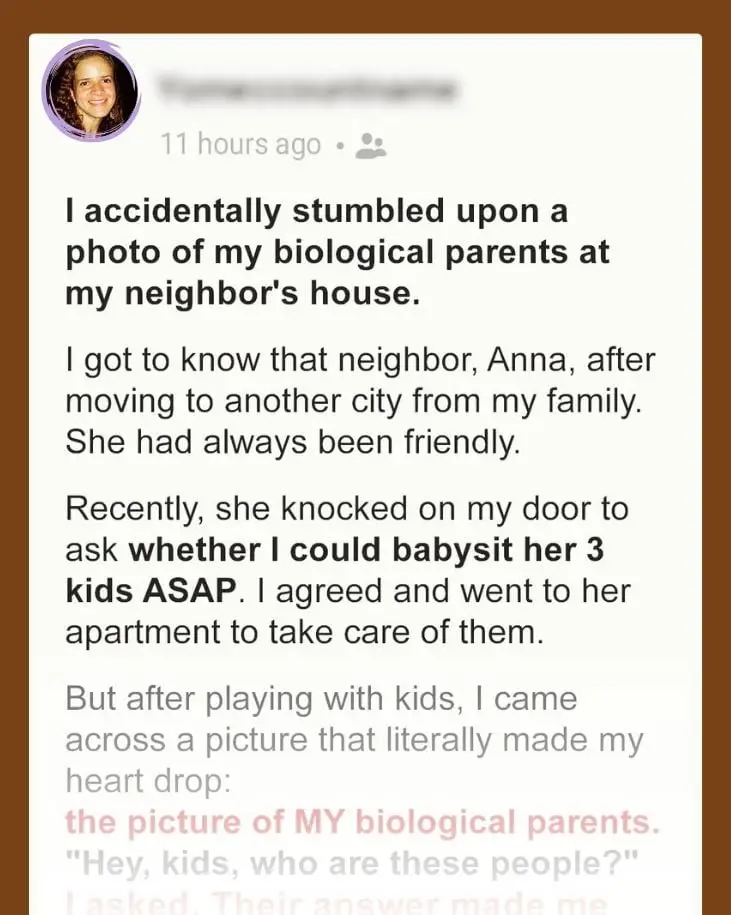 A woman accidentally stumbled upon a photo of her biological parents at her neighbor’s house.