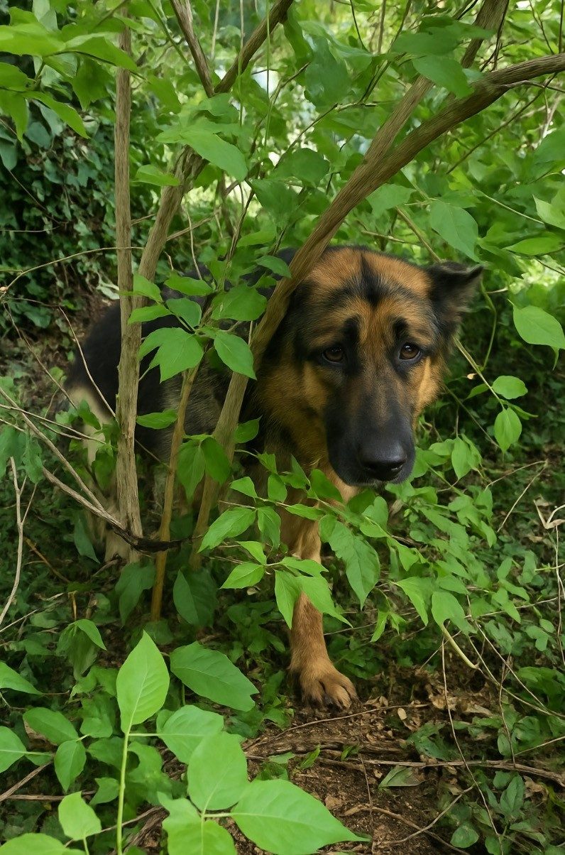 One early morning, someone called Louisville Metro Animal Services. Neighbors in a quiet area near the edge of the city had seen a big German Shepherd lying in thick bushes for three days. He never moved. They felt worried and afraid for him. What if he was hurt? What if he was tied there and could not walk away?