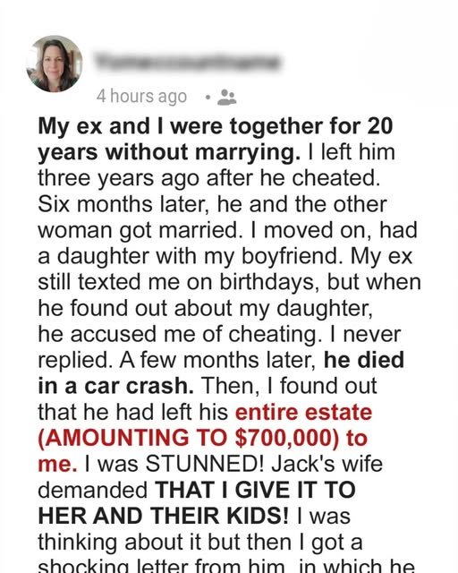 Then came the surprise I never expected: his will named me as the sole heir of his estate, nearly $700,000. I was stunned. His new wife and children were not mentioned at all, and she quickly demanded that I give everything to her.