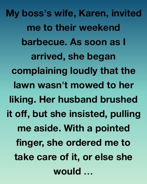 My boss’s wife, Karen, invited me to their weekend barbecue. As soon as I arrived, she began complaining loudly that the lawn wasn’t mowed to her liking. Her husband brushed it off, but she insisted, pulling me aside.
