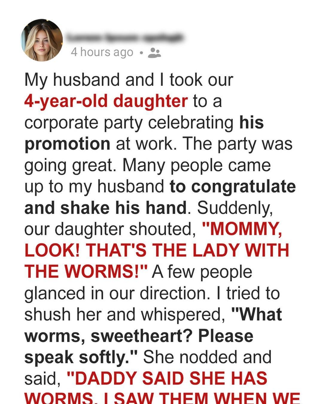 “Mommy, look! That’s the lady with the worms,” she said, loud enough for others to hear. Confused, I gently questioned her, and she explained that she had seen “red worms” on that woman’s bed—Tina, a coworker I’d noticed around Mark before.