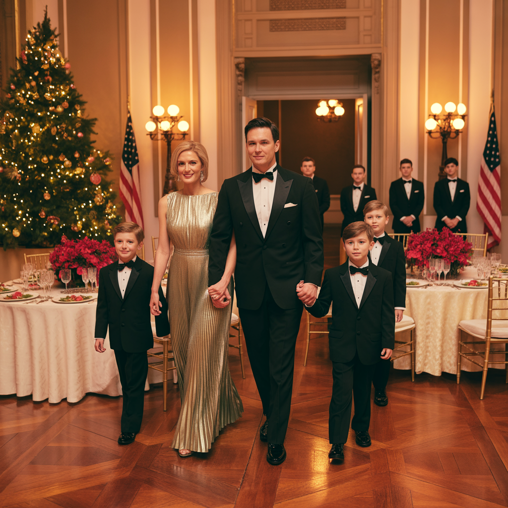 My husband, tall, calm, and looking like he owned the place, stepped in right beside me. And right behind us came our four little boys—three matching three-year-olds in tiny custom suits, and our eight-year-old leading the way like a prince.