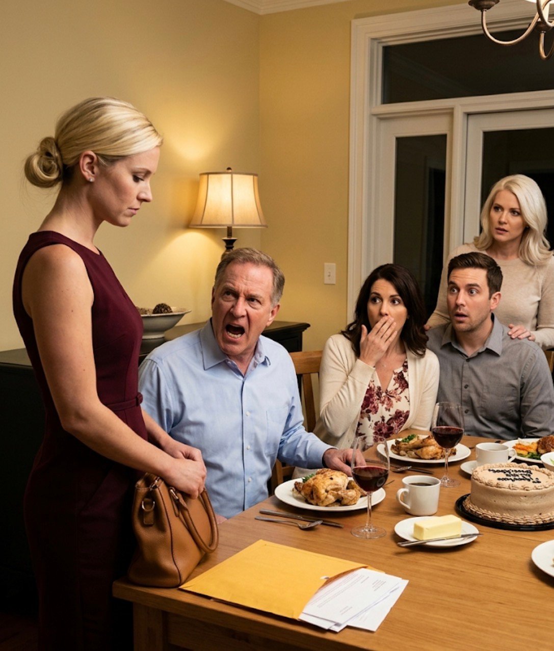 Everyone laughed. Something inside me went completely still. I stood up, reached into my purse, and placed a thick manila envelope next to his plate.