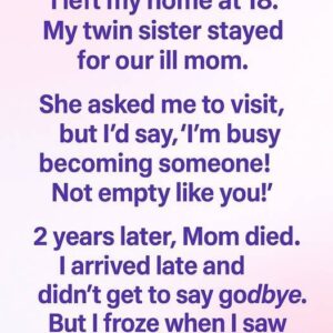 I left my home at 18. My twin sister stayed for our ill mom. She asked me to visit, but I’d say, “I’m busy becoming someone! Not…