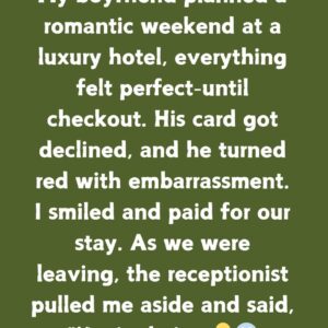 My boyfriend planned a romantic weekend at a luxury hotel, everything felt perfect—until checkout. His card got declined, and he turned red with embarrassment. I smiled and…