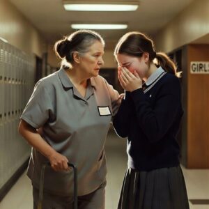 When I found a teen girl crying in the bathroom, she begged me not to tell anyone she was there. I was just the janitor, but the…