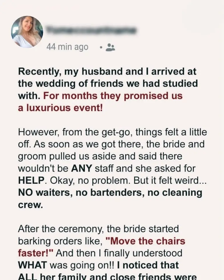 We expected luxury, not labor, at our friends’ wedding. As the bride handed out “to-do” lists (setting tables, serving drinks, even cleaning bathrooms), our excitement turned to outrage. While they enjoyed the party, we were unpaid staff… until we decided to serve up some justice.