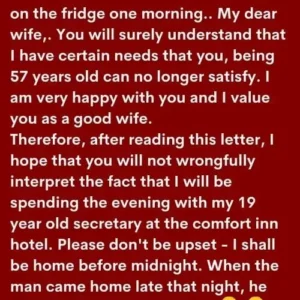 A wife finds a note from her husband on the fridge one morning: Husband’s Note “My dear wife, You will surely understand that I have certain needs…