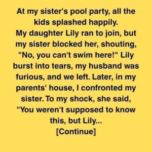 At my sister’s pool party, all the kids splashed happily. My daughter Lily ran to join, but my sister blocked her, shouting, “No, you can’t swim here!”…