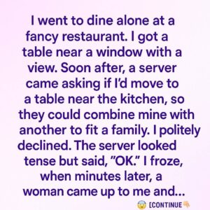I went to dine alone at a fancy restaurant. I got a table near a window with a view. Soon after, a server came asking if I’d…