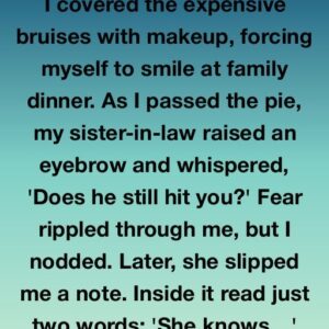 I covered the expensive bruises with makeup, forcing myself to smile at family dinner. As I passed the pie, my sister-in-law raised an eyebrow and whispered, ‘Does…