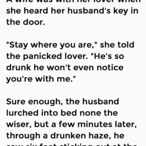 A wife was with her lover when she heard her husband’s key in the door. “Stay where you are,” she told the panicked lover. “He’s so drunk…