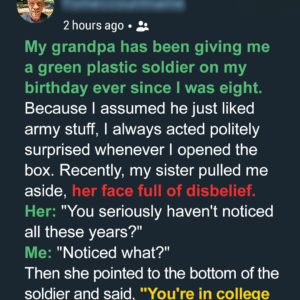 Starting on my eighth birthday, Grandpa Henry began giving me the same strange gift every year — a single green plastic soldier, wrapped in old newspaper, no…
