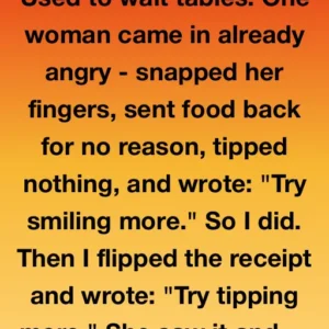 Used to wait tables. One woman came in already angry – snapped her fingers, sent food back for no reason, tipped nothing, and wrote: “Try smiling more.”…