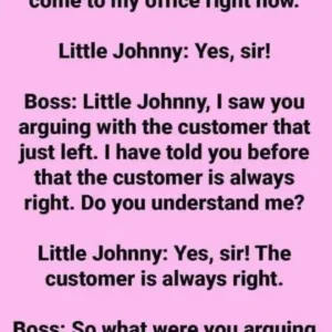 Boss: (Shouting) Little Johnny, come to my office immediately.Little Johnny: Yes, sir! Boss: Little Johnny, I noticed you arguing with the customer who just left. I’ve told…