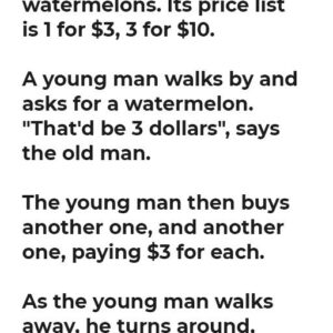 An old man is selling watermelons. Its price list is 1 for $3, 3 for $10. A young man walks by and asks for a watermelon. “That’d…