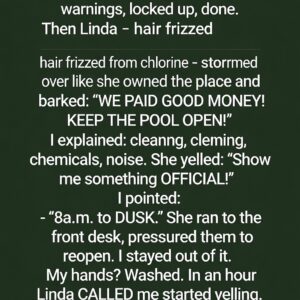I was two hours past my shift, waiting for maintenance to finish a pool filtration repair, when Linda arrived—loud, barefoot, and dragging two dripping kids. “We paid…