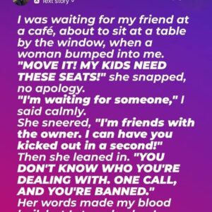 I was waiting for my friend at a café, about to sit by the window, when a woman brushed past me and said sharply, “Move it! My…