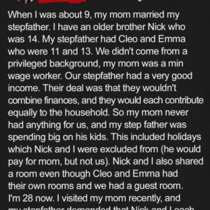 Growing up, my stepdad, Liam, made it clear my brother Nick and I were outsiders. While he spoiled his daughters with vacations and their own rooms, we…