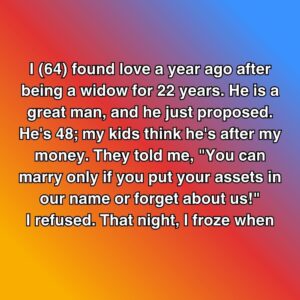 I (64) found love a year ago after being a widow for 22 years. He is a great man, and he just proposed. He’s 48; my kids…