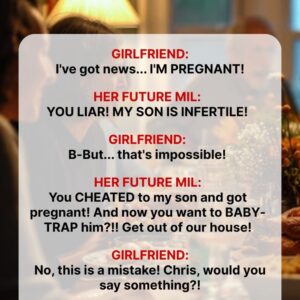 GIRLFRIEND: I’ve got news… I’M PREGNANT! HER FUTURE MIL: YOU LIAR! MY SON IS INFERTILE! GIRLFRIEND: B-But… that’s impossible! HER FUTURE MIL: You CHEATED to my son…