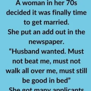 “Husband wanted. Must not beat me, must not walk all over me, must still be good in bed” She got many applicants but after a few weeks…
