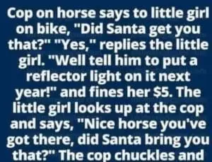 Cop on horse says to little girl on bike, “Did Santa get you that?” “Yes,” replies the little girl. “Well tell him to put a reflector light…