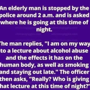 An elderly man is stopped by the police around 2 a.m. and is asked where he is going at this time of night. The man replies, “I…