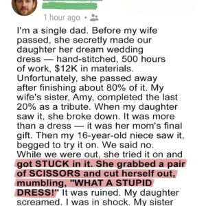My late wife, Linda, spent nearly 500 hours hand-sewing a wedding dress for our daughter, Sammy. It cost $12,000 and was her final act of love before…