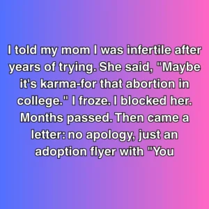 I told my mom I was infertile after years of trying. She said, “Maybe it’s karma—for that abortion in college.” I froze. I blocked her. Months passed….